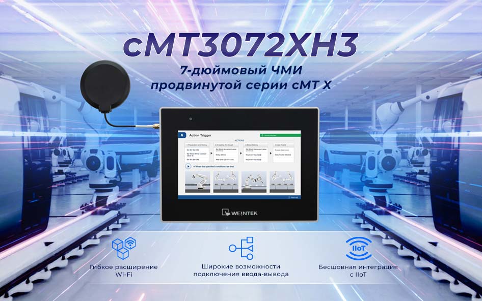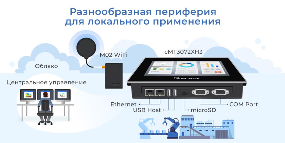cMT3072XH3 — это компактная семидюймовая панель оператора для задач, где на ограниченном пространстве требуется полноценный сбор данных со станков, визуализация и передача информации в офис или облако, желательно “по воздуху”. Модель поддерживает подключение по Wi-Fi (модуль M02) , оснащена расширенным набором интерфейсов для подключения и сбора данных и совместима с большинством протоколов, включая интеграцию в системы промышленного интернета вещей (IIoT).