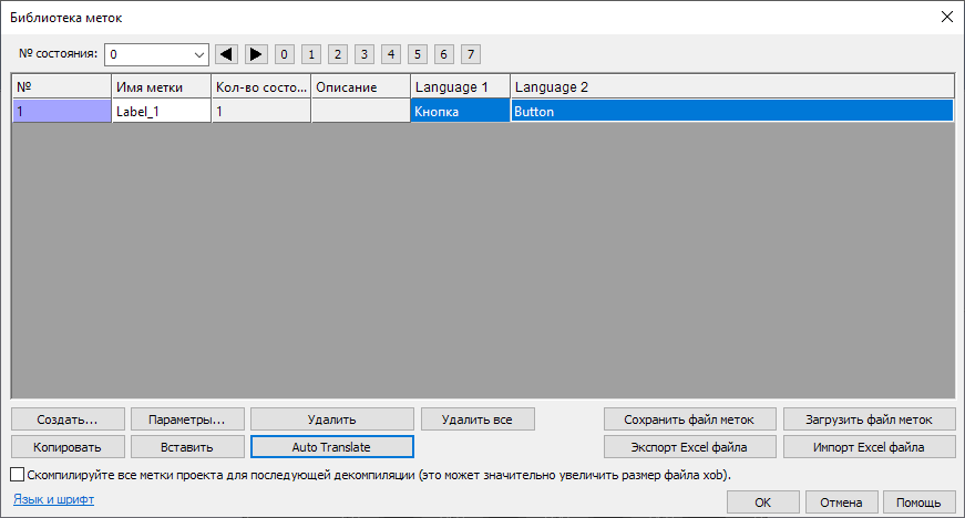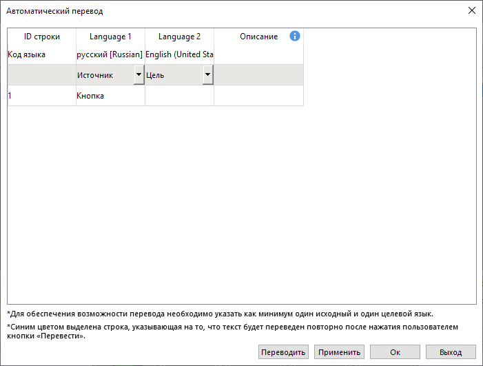 3. Чтобы автоматически перевести текст метки на язык Language 2, нажмите кнопку [Auto Translate] – откроется окно автоматического перевода. Нужно выбрать “Language 1” как “Источник”, а “Language 2” как “Цель” и нажать [Переводить];