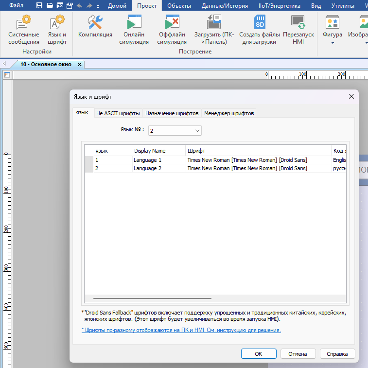 1. Для начала создайте как минимум 2 языка. Для этого перейдите во вкладку [Проект] и в разделе [Настройки] откройте [Язык и шрифт]. В появившемся окне выберите количество языков и добавьте необходимые языки. Нажмите [ОК];