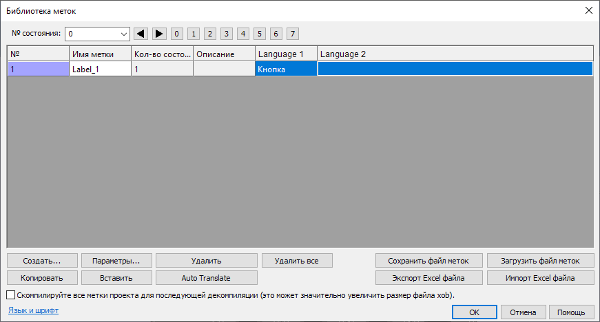 2. В этой же вкладке в разделе [Библиотека] откройте настройки объекта [Метка]. Добавьте текст для метки в поле колонки “Language 1”;
