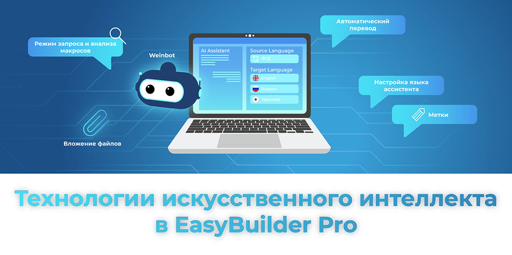 Следуя мировому тренду развития искусственного интеллекта, компания Weintek внедрила ИИ-ассистента “Weinbot” и функцию автоматического перевода (Auto Translate) в новую версию своего ПО — EasyBuilder Pro (v6.10.02). Эти инструменты способны существенно облегчить разработку проекта за счет автоматизации рутинных задач, ускорения поиска ошибок и оперативного получения ответов на вопросы. Это позволит уделить больше времени решению задач критически важной логики.